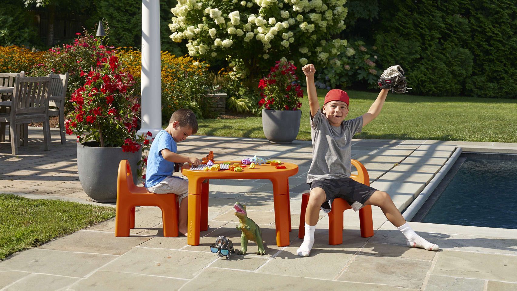 With chunky proportions and a low back, the chairs of Bauen’s $650 play set are custom designed to withstand toddler play—indoors or out.