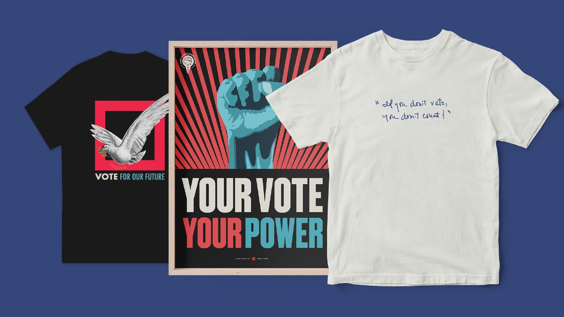 The shirts and posters from Merch Aid are raising money to promote voter engagement.